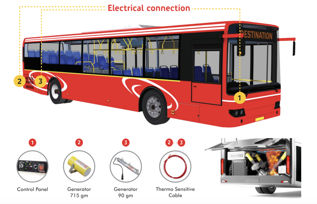 Bus fire suppression systems work by detecting and suppressing the fire before it spreads. The Linear Heat Detector cable is a double conductor steel braided cable with a special heat-sensitive insulated sheath wrapped with a protective tape and overall surrounded with a high-performance fluoropolymer sheath.